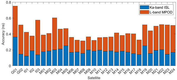 研究結果顯示,北斗三號單向星間鏈路的測距精度可達7厘米,經過全面的誤差修正后,所有衛星之間的時間同步精度可以穩定在0.4納秒以內。值得注意的是,通過本文方法與目前主流的多星高精度定軌(MPOD)方法對比,北斗三號星間鏈路系統的時間同步精度優于MPOD方法(見圖2),展現出顯著的優勢。該成果驗證了相關技術在高精度時間同步應用中的卓越性能。